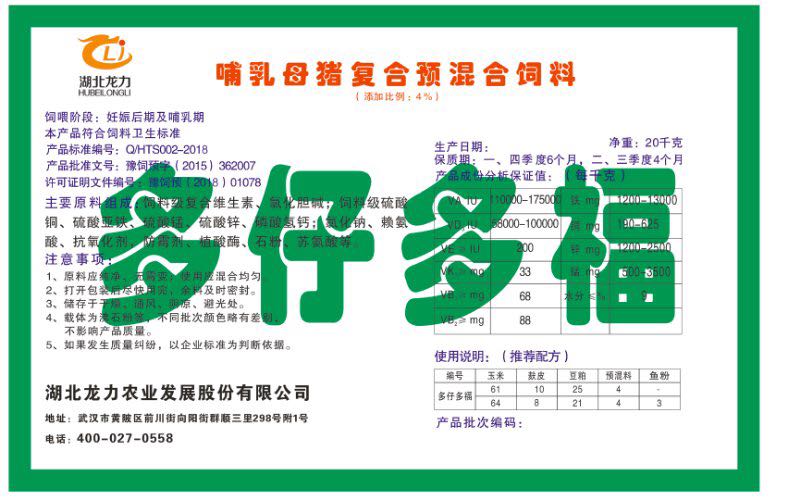 湖北龍力農業發展股份有限公司坐落于武漢市黃陂區前川街向陽街群順三里298號附1號。公司成立于2014年6月,公司自成立以來把“創全球最大養豬綜合服務”為企業愿景。致力于打造教保料品牌”作為公司發展的明確目標。公司一直致力于豬營養的研究和開發,積極與國內外高校和科研機構合作,推廣養豬技術、動物營養新概念,向世界農牧企業學習與合作。公司采用國內先進的生產工藝,選擇高精度電子配料秤,高均勻度、無殘留混合機等先進設備....